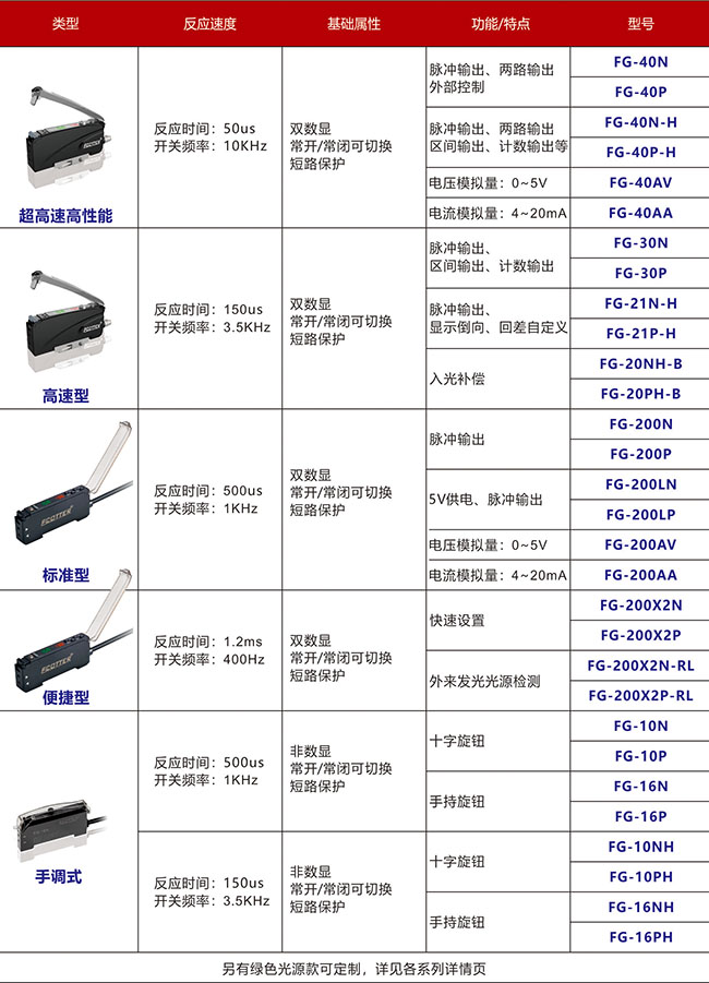 ECOTTER光纖放大器穩(wěn)定性佳,功能種類可選,有超高速高性能款FG-40系列,達(dá)到10Hkz的開(kāi)關(guān)頻率,支持兩路輸出。高速型達(dá)到3.5KHz,配備了區(qū)間輸出、計(jì)數(shù)輸出。標(biāo)準(zhǔn)型開(kāi)關(guān)頻率1KHz,便捷型400Hz,可最快速設(shè)置閥值,還有手調(diào)式的光纖放大器。