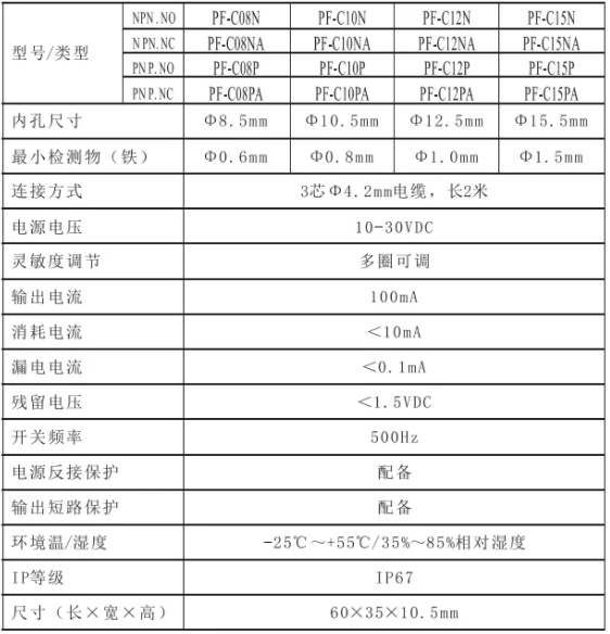 這款接近開關(guān)的整體是環(huán)形,檢測區(qū)域?yàn)閳A型,有多種尺寸可供選擇。其最小檢測物體也隨著檢測區(qū)域大小的變化而變化。最小檢測物可檢測0.6mm的磁性物體(孔徑8.5mm)